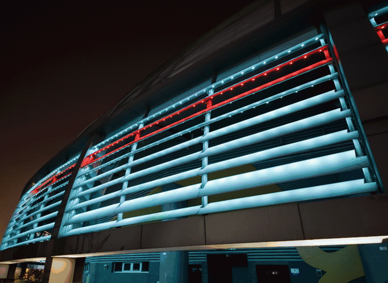 不如把LED灯内嵌在遮阳百叶内,就这么简单?No不简单!首先得考虑每个灯投射下来的光线得连成线,灯的排布太疏太密都不行;其次还得把管线先设计好为了更加的美观,管线都是预埋在百叶和龙骨里的,内嵌在百叶内的LED灯,每隔几秒便会变幻成另一种颜色,五彩斑斓,瞬息万变。夜幕下的体育馆是不是更具魅力!建筑遮阳融入夜景设计给建筑带来不一样的体验。