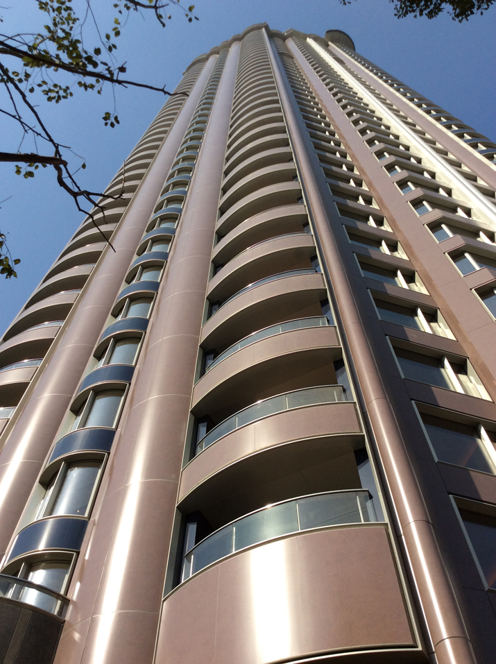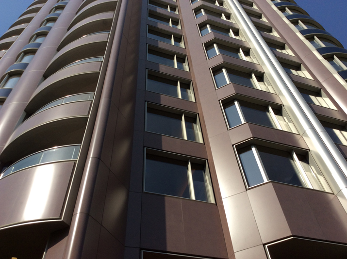 价格涨到这样的幅度或许也不足为奇,改造后华山公寓的建筑立面材料选自德国阿鲁克邦Design系列。板材在欧洲生产好后飘洋过海来到项目所在地。特殊的饰面远观像石材,如不经现场人员解说很难想象是轻质高强的铝复合板,当然略懂幕墙技术之人一眼便知石材不可能做成这样的曲面,不由让人眼前一亮。